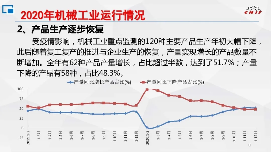 年初受疫情影响,机械工业重点监测的120种主要产品生产大幅下降,1-2月仅2种产品产量实现增长。此后随着复工复产的推进与企业生产的恢复,产品产量实现增长的品种数不断增加。全年产量增长的产品有62种,占比超过半数,达到了51.7%;产量下降的产品有58种,占比48.3%。