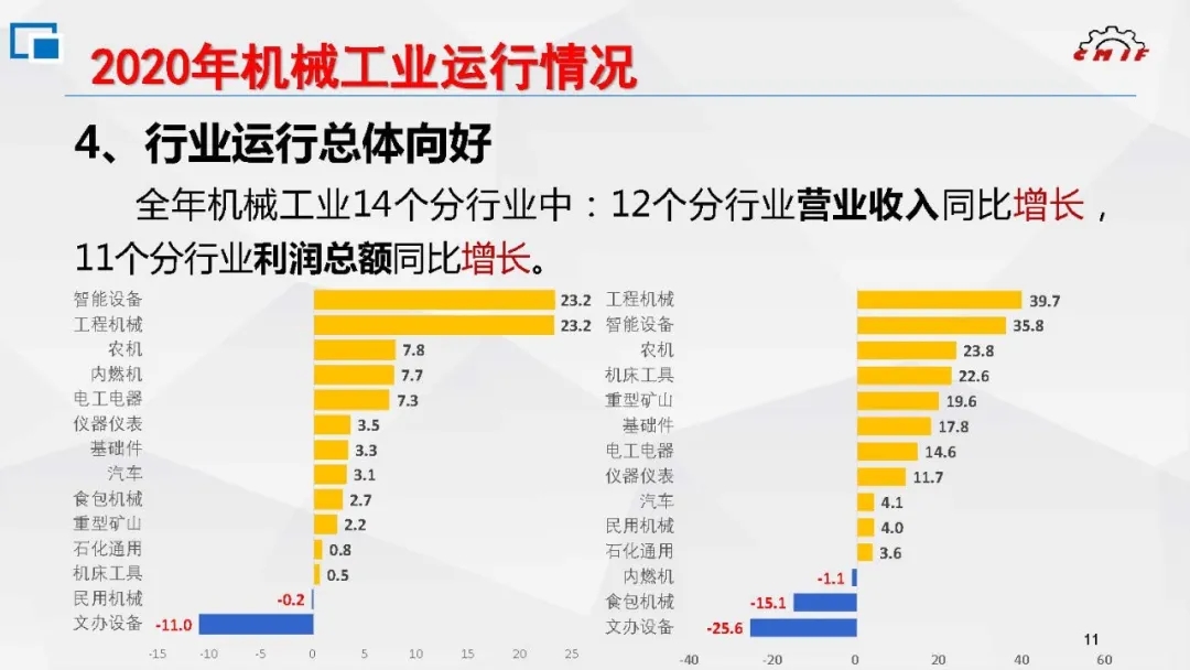 全年机械工业十四个分行业中,十二个分行业营业收入实现同比增长,其中工程机械和机器人与智能制造行业增速超过20%,农业机械、内燃机和电工电器行业增速在7%左右,仅文办设备和其他民用机械行业营业收入同比下降;十一个分行业利润总额实现同比增长,其中工程机械和机器人与智能制造行业利润增速超过30%,农业机械、机床工具、重型矿山行业利润增速在20%左右,仅内燃机、文办设备和食品包装机械行业利润同比下降。