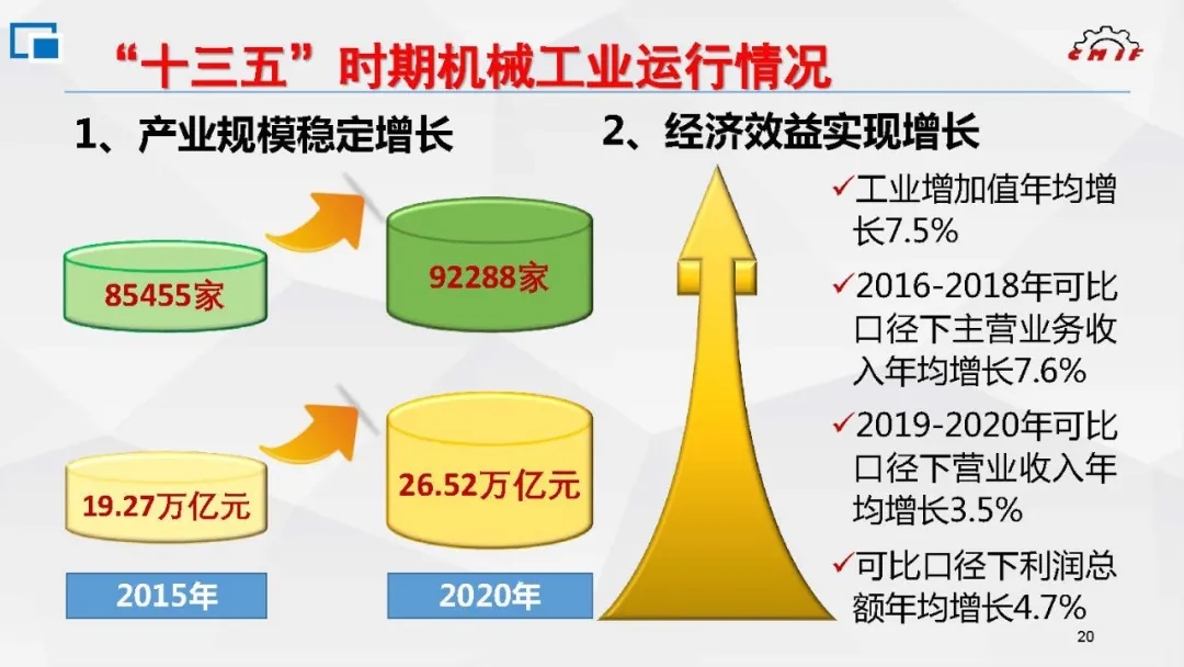 “十三五”期间,机械工业主要生产指标和经济效益指标表现出稳中有升的态势。机械工业增加值年度平均增速为7.5%。2016-2018年可比口径下,机械工业主营业务收入年均增速为7.6%;2019-2020年可比口径下,机械工业营业收入年均增速为3.5%;总量上始终超过20万亿元规模。机械工业利润总额年均增速为4.7%,总量始终保持在1万亿元以上规模。