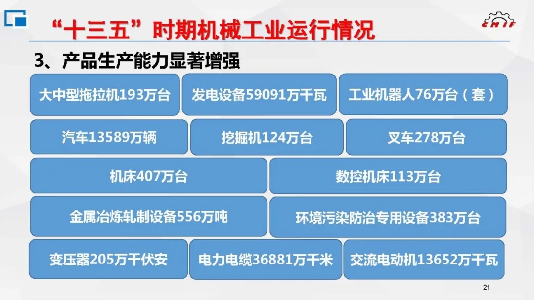 “十三五”期间,机械工业累计生产大中型拖拉机193万台、发电设备59091万千瓦、工业机器人76万台(套)、汽车13589万辆、挖掘机124万台、叉车278万台、机床407万台、其中数控机床113万台、环境污染防治专用设备383万台、金属冶炼轧制设备556万吨、变压器205万千伏安、交流电动机13652万千瓦、电力电缆36881万千米,为国民经济各行业提供了充足的设备供应与保障。