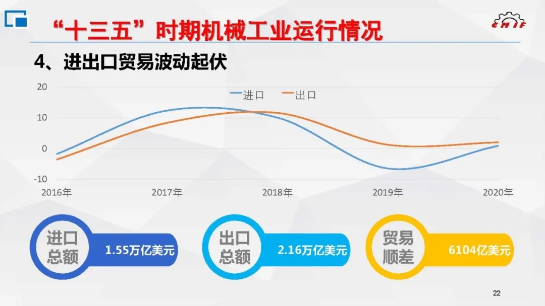 受到全球经济不振、贸易摩擦、新冠疫情等多方因素影响,“十三五”期间机械工业进出口贸易呈现波动。2016年略有回落,2017、2018年显著增长,此后总体低迷。五年间,机械工业累计实现进口总额1.55万亿美元,出口总额2.16万亿美元, 2017年以来年度进出口贸易总额保持在7000亿美元以上;累计实现贸易顺差6104亿美元,其中除2017年外,其他四年的年度贸易顺差均超过1000亿美元。贸易顺差的增长在一定程度上反映出我国机械产品的国际市场竞争力的提升。