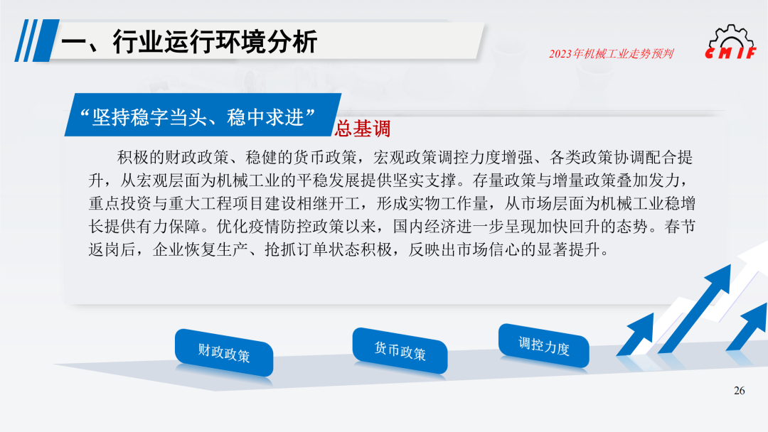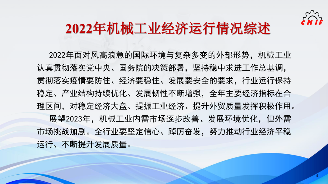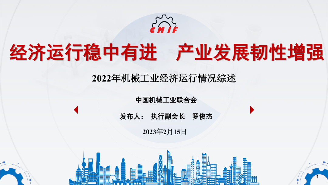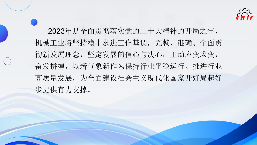 2023年是全面贯彻落实党的二十大精神的开局之年,机械工业将坚持稳中求进工作基调,完整、准确、全面贯彻新发展理念,坚定发展的信心与决心,主动应变求变,奋发拼搏,以新气象新作为保持行业平稳运行、推进行业高质量发展,为全面建设社会主义现代化国家开好局起好步提供有力支撑。