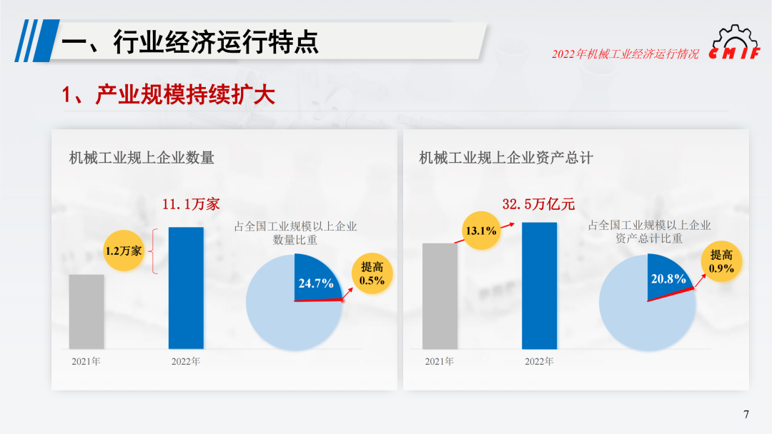 国家统计局数据显示,截至2022年末,机械工业共有规模以上企业11.1万家,较上年增加1.2万家,占全国工业规模以上企业数量的24.7%,较上年提高0.5个百分点;资产总计32.5万亿元,同比增长13.1%,占全国工业资产总计的20.8%,较上年提高0.9个百分点。