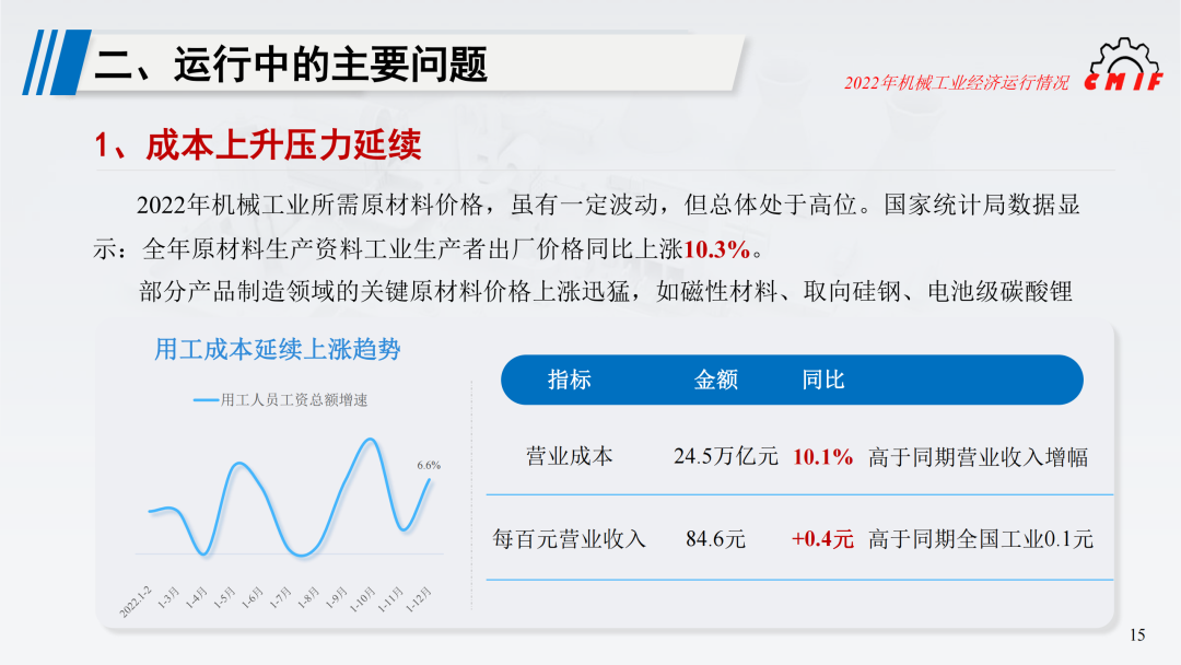 2022年机械工业所需原材料价格虽有一定波动,但总体处于高位。国家统计局数据显示,全年原材料生产资料工业生产者出厂价格同比上涨10.3%。此外部分产品制造领域的关键原材料价格上涨迅猛。如低压电气行业用磁性材料,变压器用取向硅钢片等价格大幅上涨;储能行业用电池级碳酸锂均价由2021年末的28万元/吨升至2022年末52万元/吨,11月价格一度冲高至近60万元/吨。此外,用工成本延续上涨趋势,重点联系企业用工人员工资总额同比增长6.6%。全年机械工业发生营业成本共计24.5万亿元,同比增长10.1%,高于同期营业收入增幅;每百元营业收入中的成本为84.6元,比上年增加0.4元。