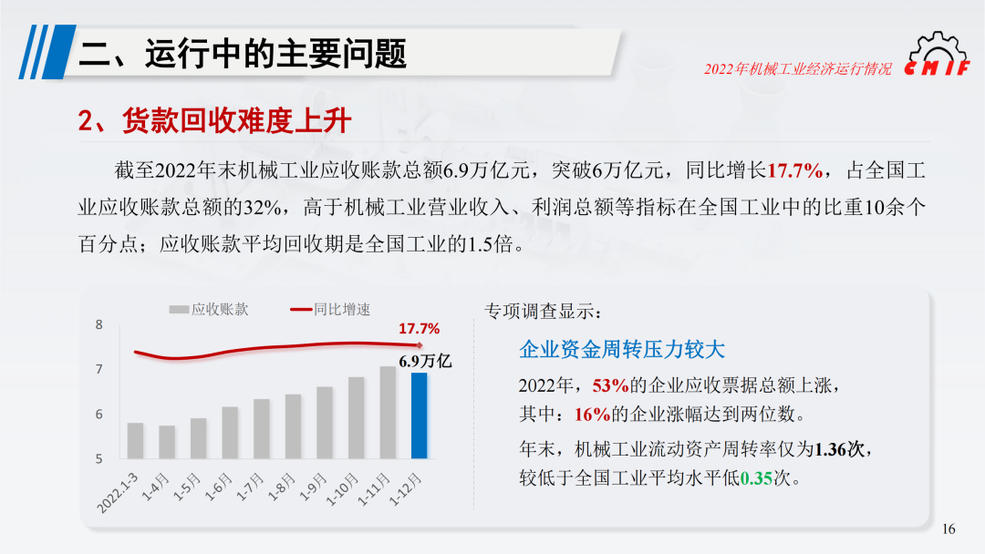 国家统计局数据显示,截至2022年末机械工业应收账款总额6.9万亿元,突破6万亿元,同比增长17.7%,占全国工业应收账款总额的32%,高于机械工业营业收入、利润总额等指标在全国工业中的比重10余个百分点;应收账款平均回收期是全国工业的1.5倍。此外专项调查显示,2022年53%的企业应收票据总额上涨,其中16%的企业涨幅达到两位数,企业资金周转压力较大。年末机械工业流动资产周转率仅为1.36次,低于全国工业平均水平0.35次。