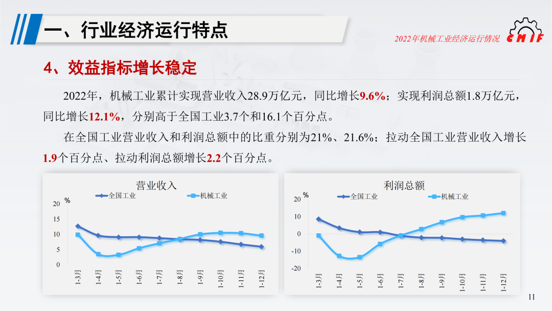 技术进步与产品结构升级有效带动行业效益增长。国家统计局数据显示,2022年机械工业累计实现营业收入28.9万亿元,同比增长9.6%;实现利润总额1.8万亿元,同比增长12.1%。与全国工业相比,机械工业营业收入与利润总额的增速分别高于全国工业3.7个和16.1个百分点。在全国工业营业收入和利润总额中的比重分别为21%、21.6%;拉动全国工业营业收入增长1.9个百分点、拉动利润总额增长2.2个百分点。
