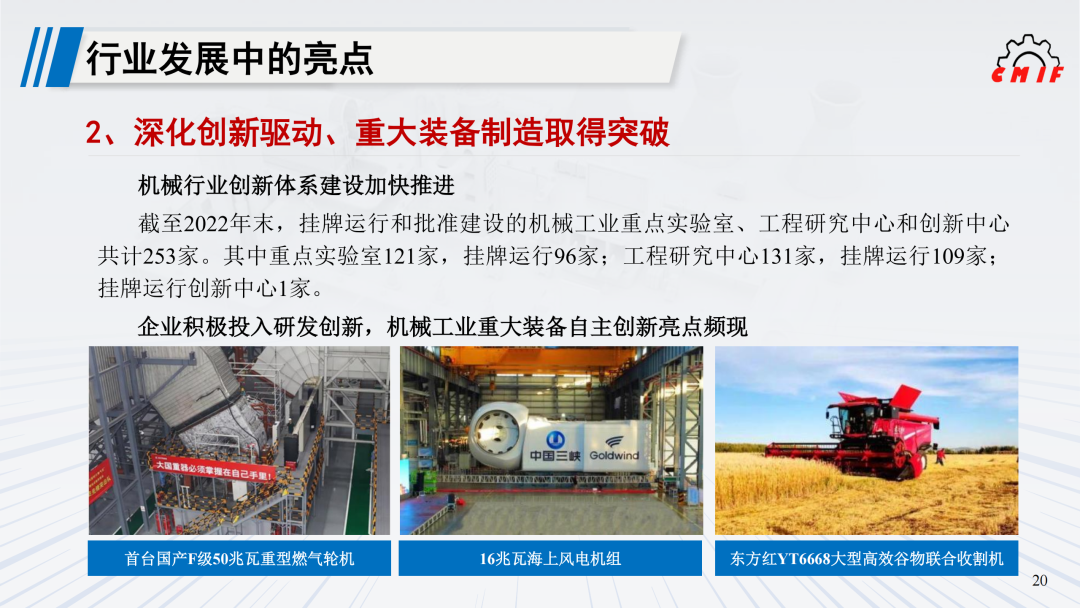 机械行业创新体系建设加快推进,截至2022年末,挂牌运行和批准建设的机械工业重点实验室、工程研究中心和创新中心共计253家。其中重点实验室121家,挂牌运行96家;工程研究中心131家,挂牌运行109家;挂牌运行创新中心1家。企业积极投入研发创新,重大装备自主创新亮点频现。东方电气集团自主研发的首台国产F级50兆瓦重型燃气轮机,在华电清远华侨工业园天然气分布式能源站点火成功,标志着我国在重型燃气轮机领域实现从无到有的突破。中国三峡集团与新疆金风科技联合研制的全球单机容量最大、叶轮直径最大、单位兆瓦重量最轻的16兆瓦海上风电机组下线,标志着我国海上风电大容量机组在高端装备制造能力上实现重要突破。一拖集团成功研发具有全部自主知识产权,喂入量15公斤以上智能化高端收获机械——东方红YT6668大型高效谷物联合收割机,打破国外产品在该领域的垄断,以高质量农机装备护航粮食安全。