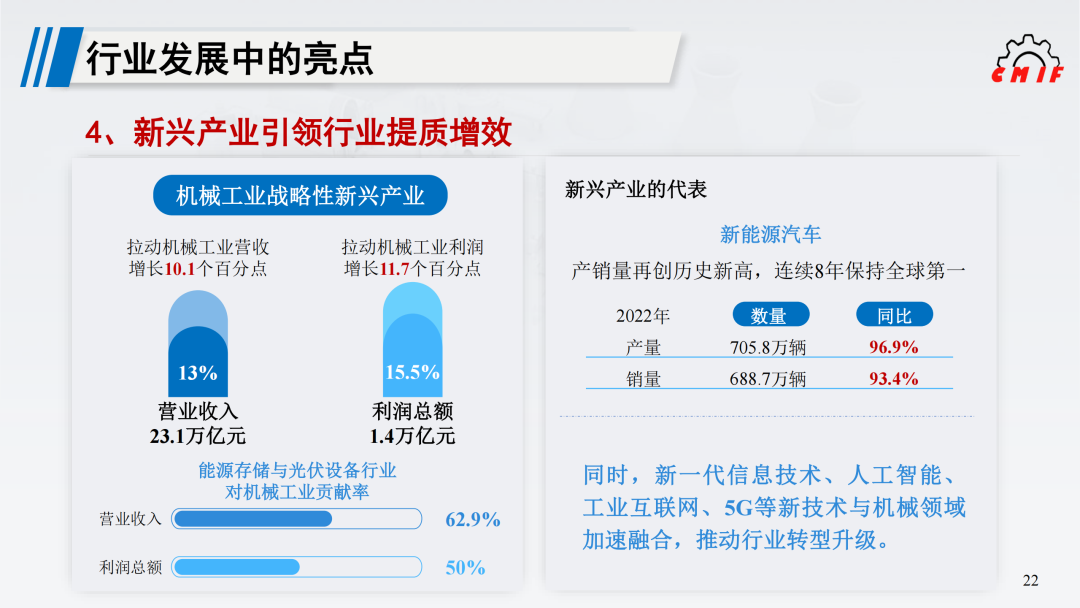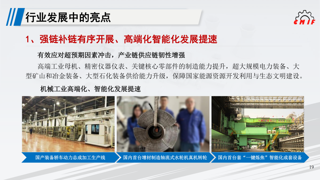 有效应对超预期因素冲击,产业链供应链韧性增强。高端工业母机、精密仪器仪表、关键核心零部件的制造能力提升,超大规模电力装备、大型矿山和冶金装备、大型石化装备供给能力升级,为国家能源资源开发利用与生态文明建设提供保障。机械工业高端化、智能化发展提速。上海交大智邦科技联合普什宁江机床、华中数控等单位研制的国产装备轿车动力总成加工生产线在上海通用汽车投入使用,标志着国产化功能部件组成的高端加工中心已能完全满足高档汽车动力总成的加工需求。哈电集团成功制造国内首台增材制造轴流式水轮机真机转轮,对推动智能制造技术在发电设备制造领域的应用具有重要意义。太重集团设计研发的国内首台套“一键炼焦”智能化成套设备投入运行,填补国内焦化行业技术空白。