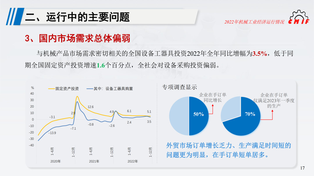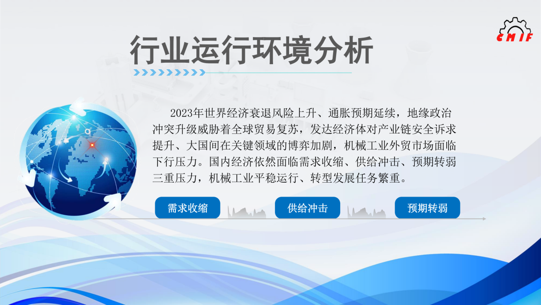 2023年世界经济衰退风险上升、通胀预期延续,地缘政治冲突升级威胁着全球贸易复苏,发达经济体对产业链安全诉求提升、大国间在关键领域的博弈加剧,机械工业外贸市场面临下行压力。国内经济依然面临需求收缩、供给冲击、预期转弱三重压力,机械工业平稳运行、转型发展任务繁重。