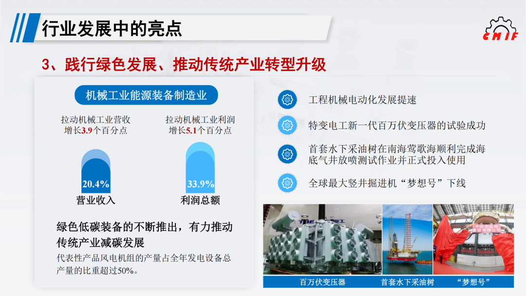 “双碳”目标引领下,机械工业全力助推传统产业转型升级。2022年机械工业能源装备制造业营业收入与利润总额同比分别增长20.4%和33.9%,拉动机械工业营业收入增长3.9个百分点、利润总额增长5.1个百分点。代表性产品风电机组的产量占全年发电设备总产量的比重超过50%。绿色低碳装备不断涌现,有力推动传统产业减碳发展。工程机械电动化发展提速,产品体系日趋完善,全年电动装载机销量已突破一千台,将推动工程建设领域绿色发展。特变电工新一代百万伏变压器试验成功,对提升我国清洁能源消纳、保障电网稳定运行具有重要作用。中国海油牵头研发的我国首套水下采油树在南海莺歌海顺利完成海底气井放喷测试作业并正式投入使用,标志着我国已具备深水水下采油树成套装备的设计建造和应用能力,对提高国内能源自给率提供重要装备保障。中国铁建为上海市静安区地下智慧车库项目不仅打造我国自主研制的全球最大竖井掘进机“梦想号”,并创新提出利用装配式垂直掘进技术在城市零星土地建造地下立体智慧停车库的全系统解决方案,对优化城市地下空间利用、推进智慧城市建设具有积极意义。