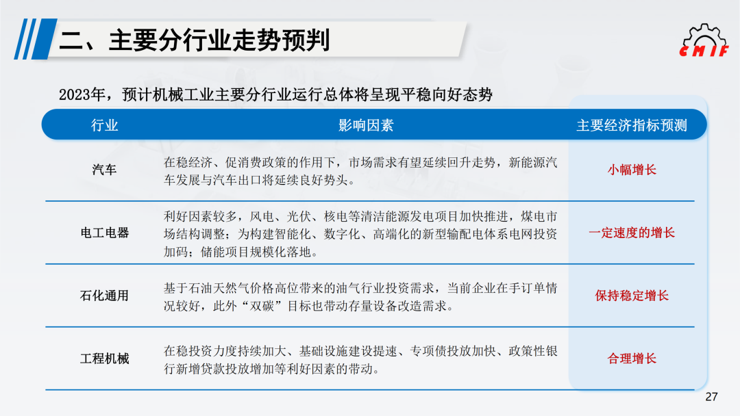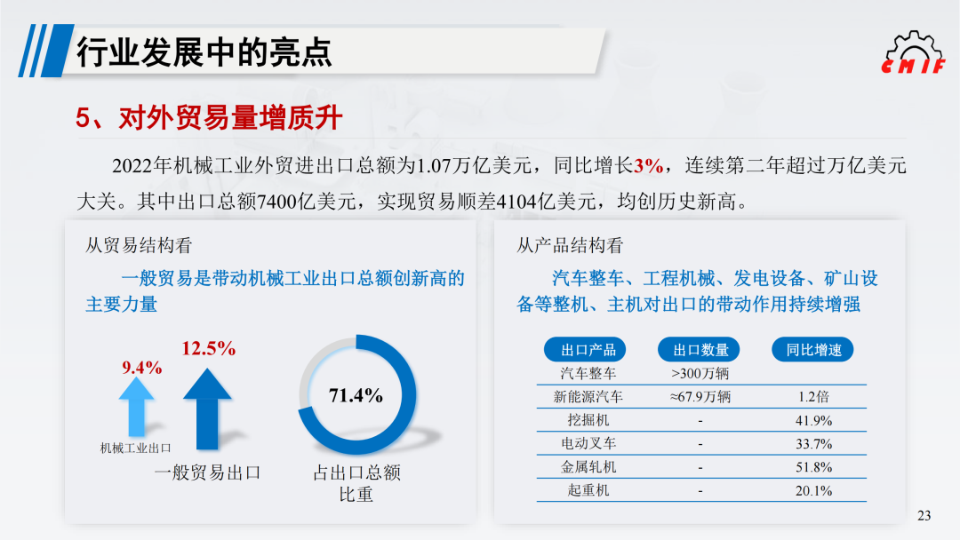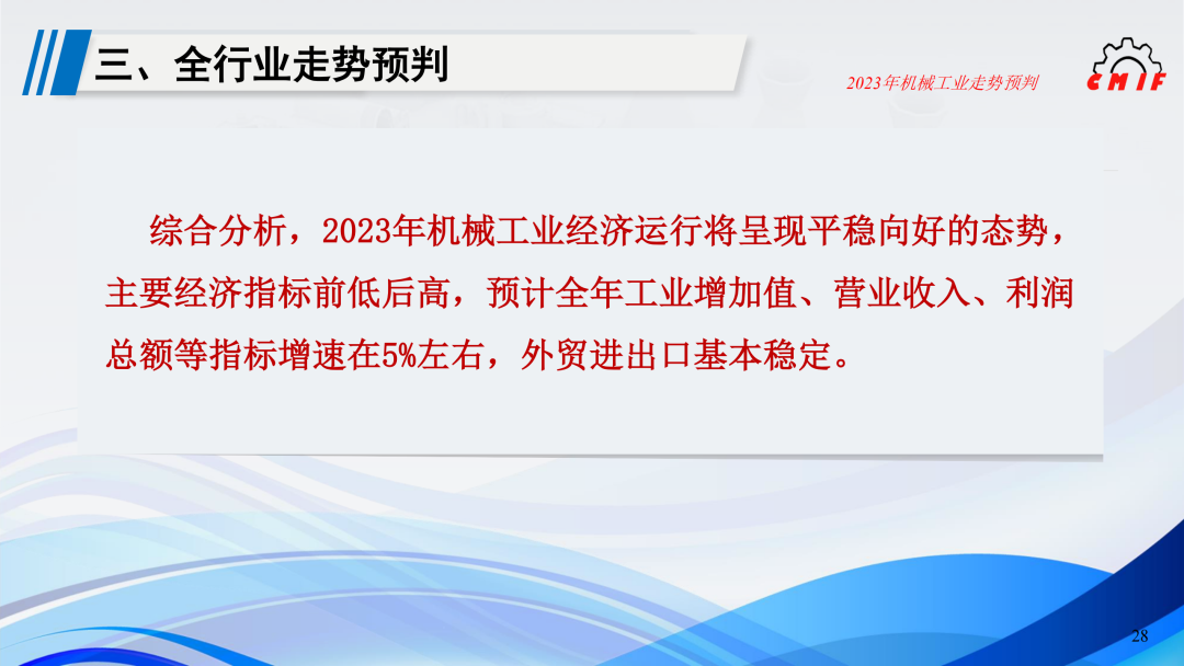综合分析,2023年机械工业经济运行将呈现平稳向好的态势,主要经济指标前低后高,预计全年工业增加值、营业收入、利润总额等指标增速在5%左右,外贸进出口基本稳定。