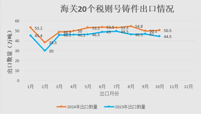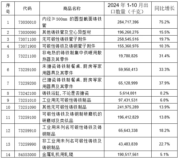 根据海关数据统计,2024年1-10月我国铸件出口数量同比增长,20个税则号出口总量507万吨,同比增长12.4%,出口总额141.9亿美元,同比增长5.8%。