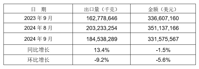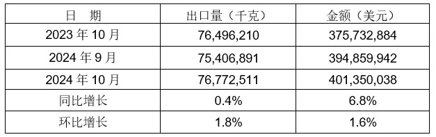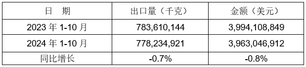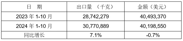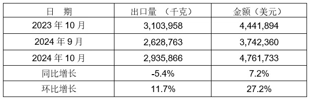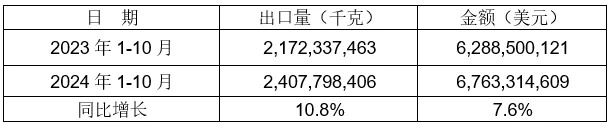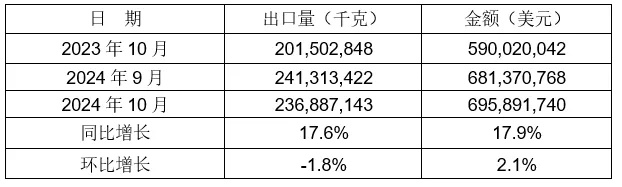 其中10月份,20个税则号共计出口50.5万吨,同比增长13.4%,环比增长0.8%;出口金额14.3亿美元,同比增长12.4%,环比增长1.7%。