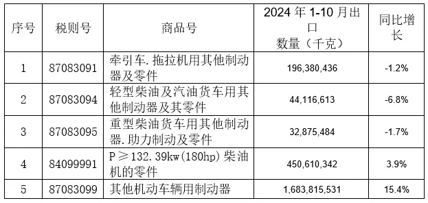 1-10月5个税则号汽车零部件合计出口240.8万吨,同比增长10.8%。其中:10月份出口23.7万吨,同比增长17.6%,环比下降1.8%,见表5和表6。