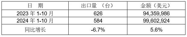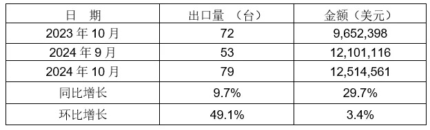 1-10月冷室压铸机共计出口584台,同比下降6.7%。其中:10月份出口79台,同比增长9.7%,环比增长49.1%,见表9和表10。