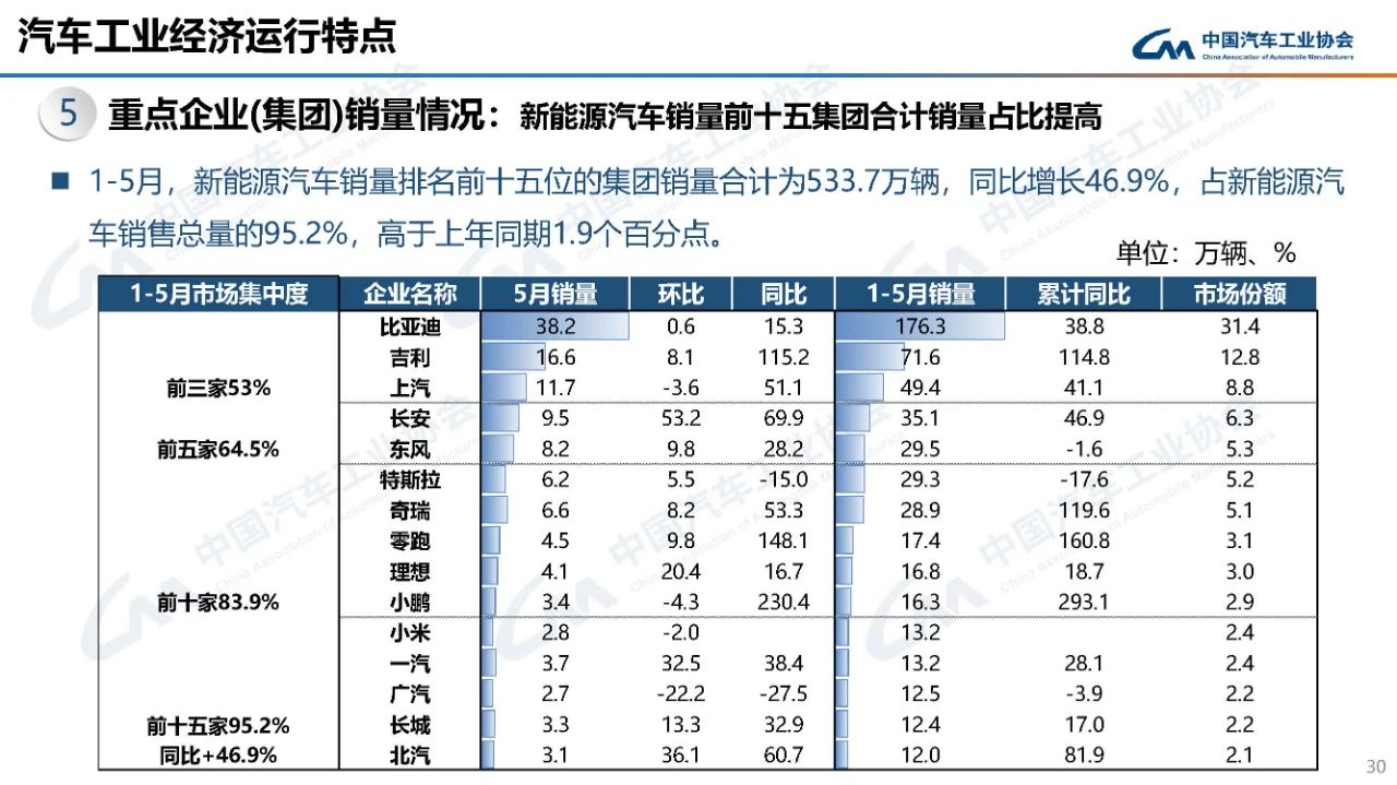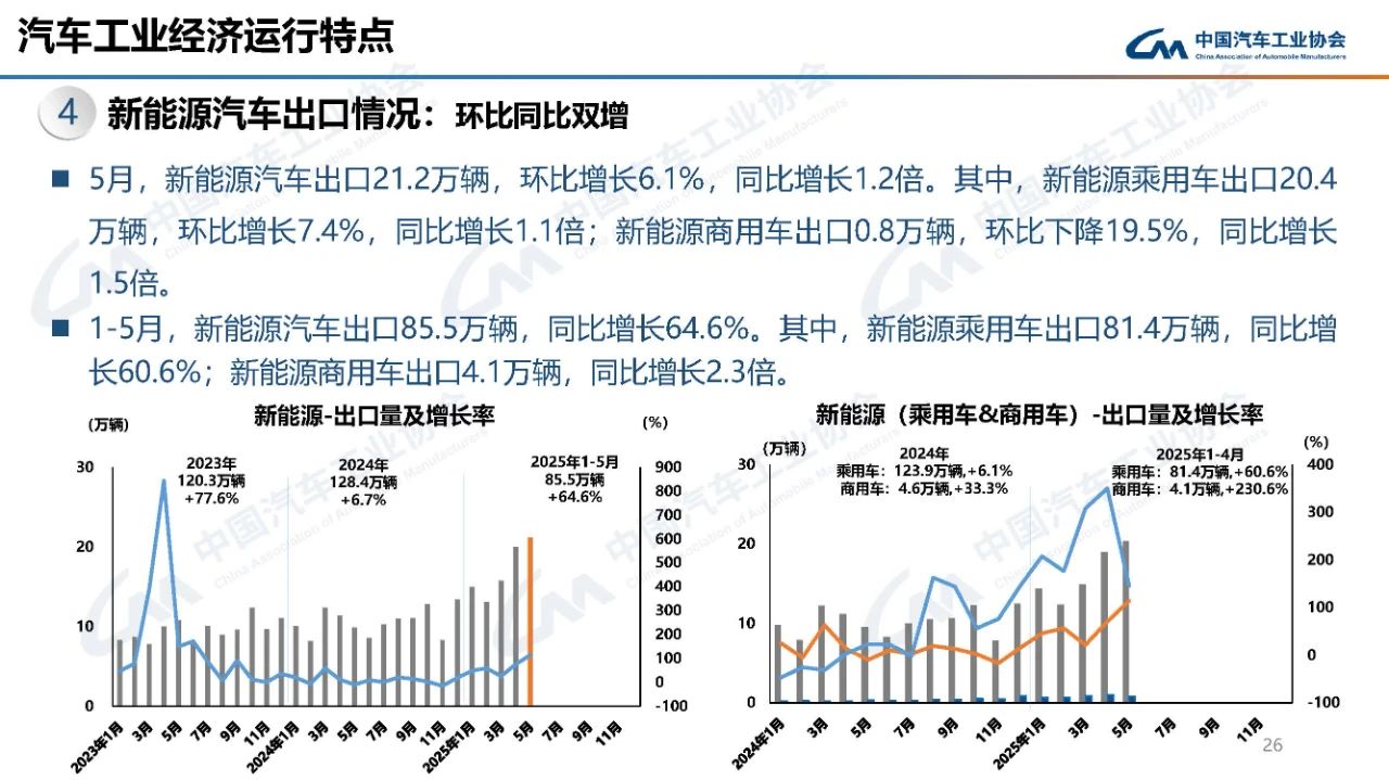 据中国汽车工业协会分析,5月,汽车市场延续良好态势,产销较去年同期实现10%以上的增长,且内需和出口均有较好的表现。其中,乘用车市场表现活跃,商用车市场仍有待恢复,新能源汽车继续快速增长,汽车出口增速有明显的提高。