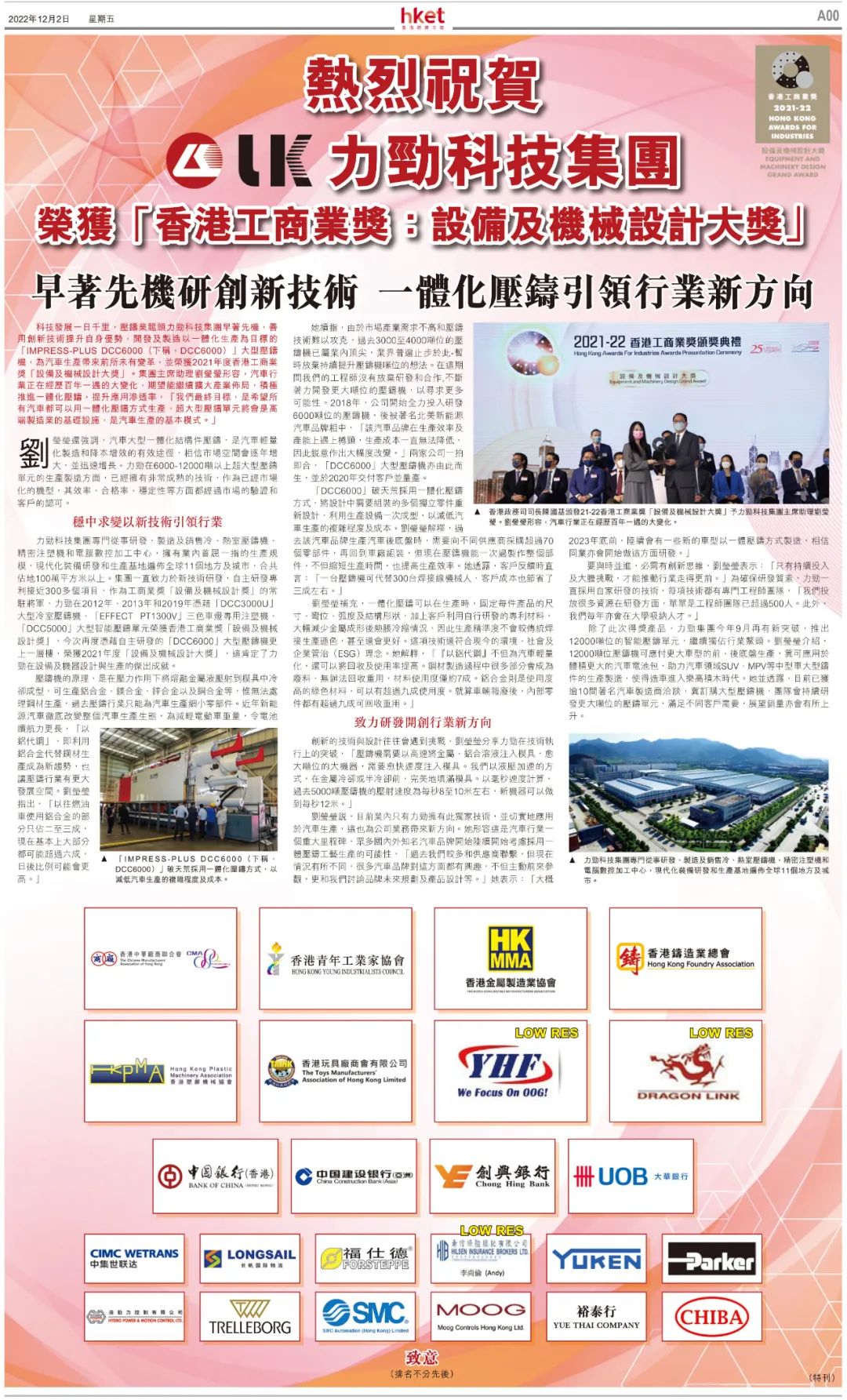 2021-22香港工商业奖评审委员会认为:“力劲DCC6000冷室压铸机能一体化压铸出电动车的后底板部分,可以大大节省用料、生产时间及减低车身重量,从而降低生产成本及车辆能源损耗。机台采用了专利设计——线性导轨技术及进一步优化了机台的整体结构,因而增加机器的生产能力,提高效率,将不可能变成可能。力劲创新设计的DCC6000超大型压铸机突破了汽车的车身设计及生产,更为新能源汽车行业带来颠覆性的变革。”