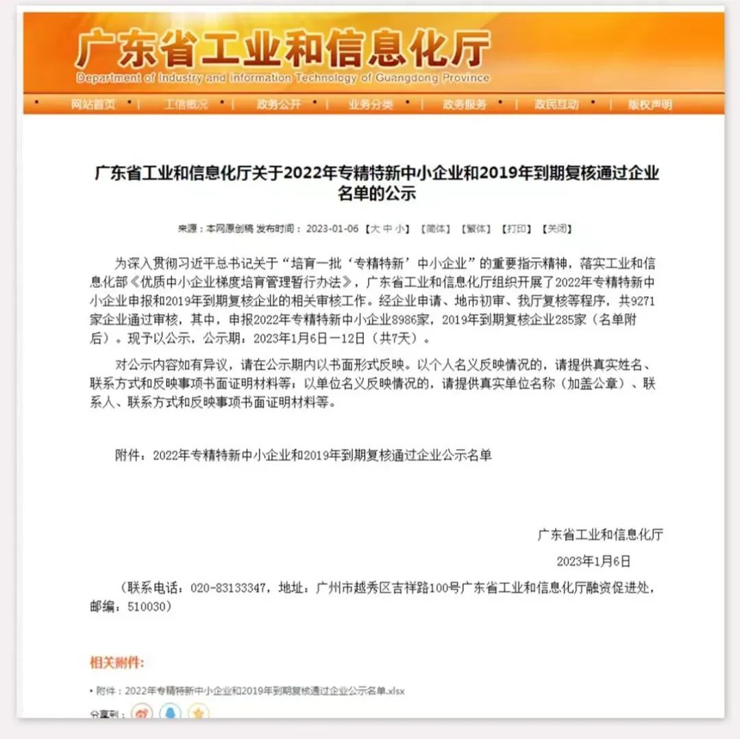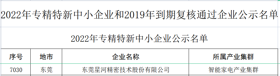 近日,广东省工业和信息化厅发布了《关于2022年专精特新中小企业名单》的公示,东莞星河精密技术股份有限公司成功入选,顺利通过广东省“专精特新”中小企业认定!