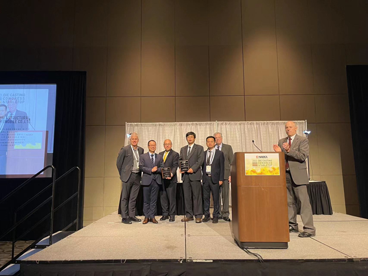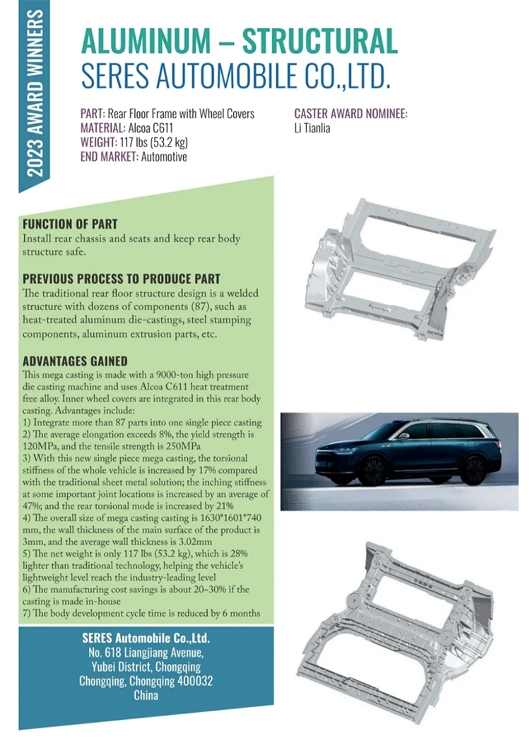 此次盛会颁发了北美压铸协会诸多年度大奖,其中,最值得关注的是最佳结构件评比大奖(Aluminum Structural),堪比压铸界的奥斯卡。经过激烈的竞争和评比,继去年之后,本次最佳结构件评比大奖再一次颁给了国内车企的大型一体化压铸部件。由赛力斯汽车主导设计、文灿集团制造、帅翼驰新材料集团 /美铝供应材料,三方联合申报的“集成轮罩后地板总成(Rear Floor with Wheel Covers)方案”摘得桂冠。该方案的铸件重53.2公斤,实现了市面上一体化压铸部件中最高的集成度(87件集成为1件),应用了最大吨位压铸机(力劲9000吨);同时,该铸件实现了平均壁厚3.02mm,以及28%的轻量化效果,为车身开发周期缩短为6个月提供了有力的支撑。