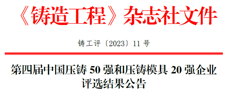 根据《关于开展第四届“中国压铸50强”、“中国压铸模具20强”等荣誉称号评选活动的通知》(铸工评〔2023〕1号)要求,《铸造工程》杂志社组织相关专家,依据评审细则,本着客观、公开、公正与公平的原则,对申报企业进行了综合评价。经过企业报名、材料初审、专家评审、评选结果公示等程序,评选出第四届中国压铸50强、压铸成长之星和压铸模具20强企业,现将评选结果公告如下(见附件)。