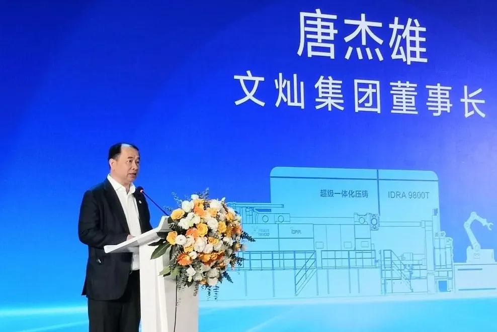 启动仪式上,唐杰雄董事长对各位领导和嘉宾的到来表示衷心的感谢,回溯文灿集团与赛力斯汽车颇有渊源的合作缘分,自2021年,共同开发的第一期的十个车身结构件全部试制成功,同时达成共识,立志在重庆地区打造高端智能网联新能源生产基地。到今天,是赛力斯汽车和文灿集团战略合作框架下的一个全新尝试,亦是文灿集团与力劲集团、上海发那科一次技术创新的梦幻联动,主要为问界M9提供舱、后地板和左右一体化侧围等四大铸件的生产;设计开发了10个车身结构件和一体化大铸件,总计代替了超过280多个零部件,焊接点减少1440多个,总机下降70%,充分体现了M9集成度高、性能强、轻量化显著的优势。随着本次万吨超级压铸岛的投产,也标志着文灿集团目前是全球单月大铸件产量最大、下线最多的企业,引领行业。
