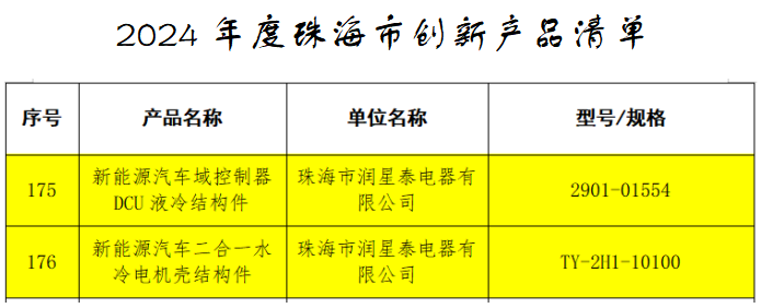 2025年4月14日,珠海市科技创新局正式发布《2024年度珠海市创新产品清单》,珠海市润星泰电器有限公司(以下简称“润星泰”)自主研发的“新能源汽车域控制器DCU液冷结构件”与“新能源汽车二合一水冷电机壳结构件”成功入选,标志着企业在新能源汽车核心零部件领域的技术创新实力再获权威认可。