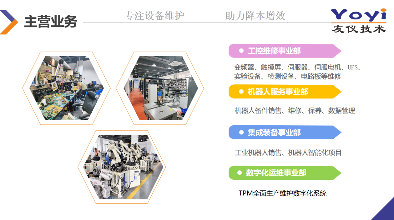 广东友仪技术股份有限公司 创立于2007年7月,下设四个技术部门: 工控维修事业部,机器人服务事业部,集成装备事业部,数字化运维事业部。为国家高新技术企业,专精特新中小企业,创新型中小企业。成立以来累计服务的客户上千家,大多是各细分行业的龙头企业,累计营业额超三亿,以华南地区为中心辐射全国,在设备后市场维护领域享有较高的知名度和良好的美誉度。通过十五年的发展,友仪技术拥有多项自己的专利和技术积累,公司树立与客户建立共赢发展的伙伴关系,为降低企业生产设备停机率,减少生产设备维护成本,实现生产设备使用率最大化一直在努力,专注于成为企业生产设备维护,降本增效的首选供应商,我们致力于成为行业标杆,筑造友仪品牌。