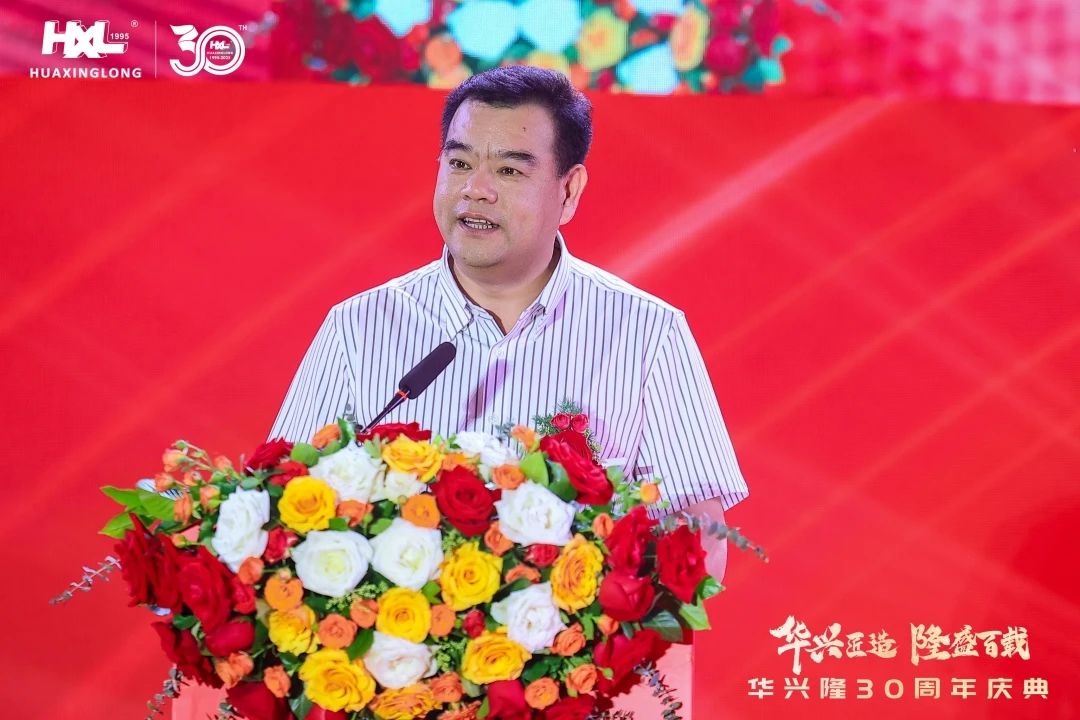 东莞雁田村党委书记邓泽荣先生作为当地政府代表,在致辞中充分肯定了华兴隆十五年来在雁田村产业转型中的关键作用。他表示,华兴隆不仅是区域经济的“强劲引擎”、民生福祉的“坚实后盾”,还是创新发展的“开路先锋”,为村集体经济发展注入了澎湃动能,助力村民就业增收,并推动了产业升级,作出了卓越贡献。他也期待企业能够继续在绿色制造、智能制造等领域开拓创新,为雁田村的产业转型升级注入新活力。同时,他承诺村委将一如既往地提供政策扶持等全方位服务,与华兴隆共谱政企合作新篇章。